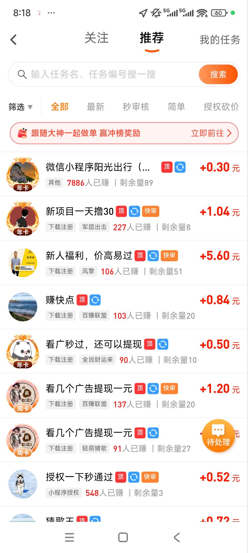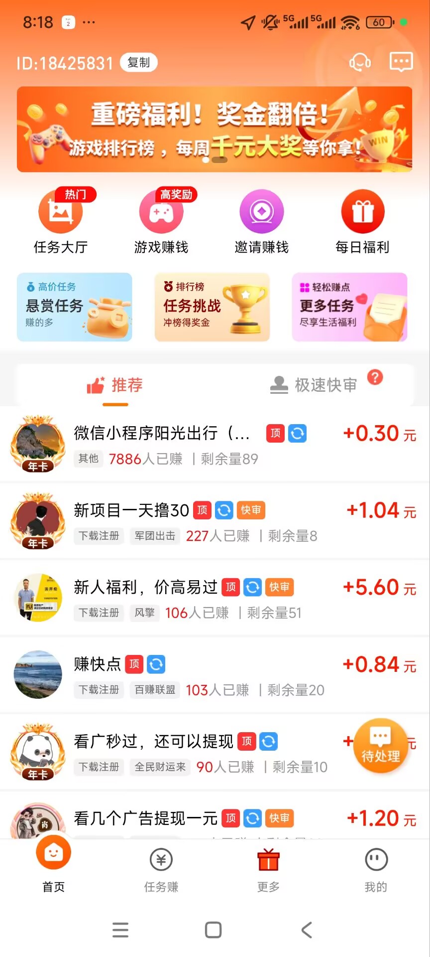 安卓下载 每天赚点是一款悬赏任务软件,用户可以做任务赚钱,有悬赏任务、游戏任务、视频任务、小程序任务等等,每个用户都有详细的介绍,新手做任务也很快的。在每天赚点做任务每周还有做任务的排行榜,只要做任务的数量达到... 每天赚点 支 持:安卓 大 小:29.8M 开发者:深圳市谷从互联网技术服务有限公司 提 现:1元起提现 说 明:空闲时间做任务领红包 分 类:悬赏任务 下载量:74次 发 布:2025-12-23 手机扫码免费下载 纠错留言 #每天赚点截图 #每天赚点简介 每天赚点是一款悬赏任务软件,用户可以做任务赚钱,有悬赏任务、游戏任务、视频任务、小程序任务等等,每个用户都有详细的介绍,新手做任务也很快的。在每天赚点做任务每周还有做任务的排行榜,只要做任务的数量达到要求之后就可以获得相应的收入。1,签到:每天签到即可免费领取金币。2,邀请好友:邀请好友一起玩,还可获取更多奖励,邀请越多,奖励越多。3,新人福利:更有新人注册惊喜红包等你来开启。