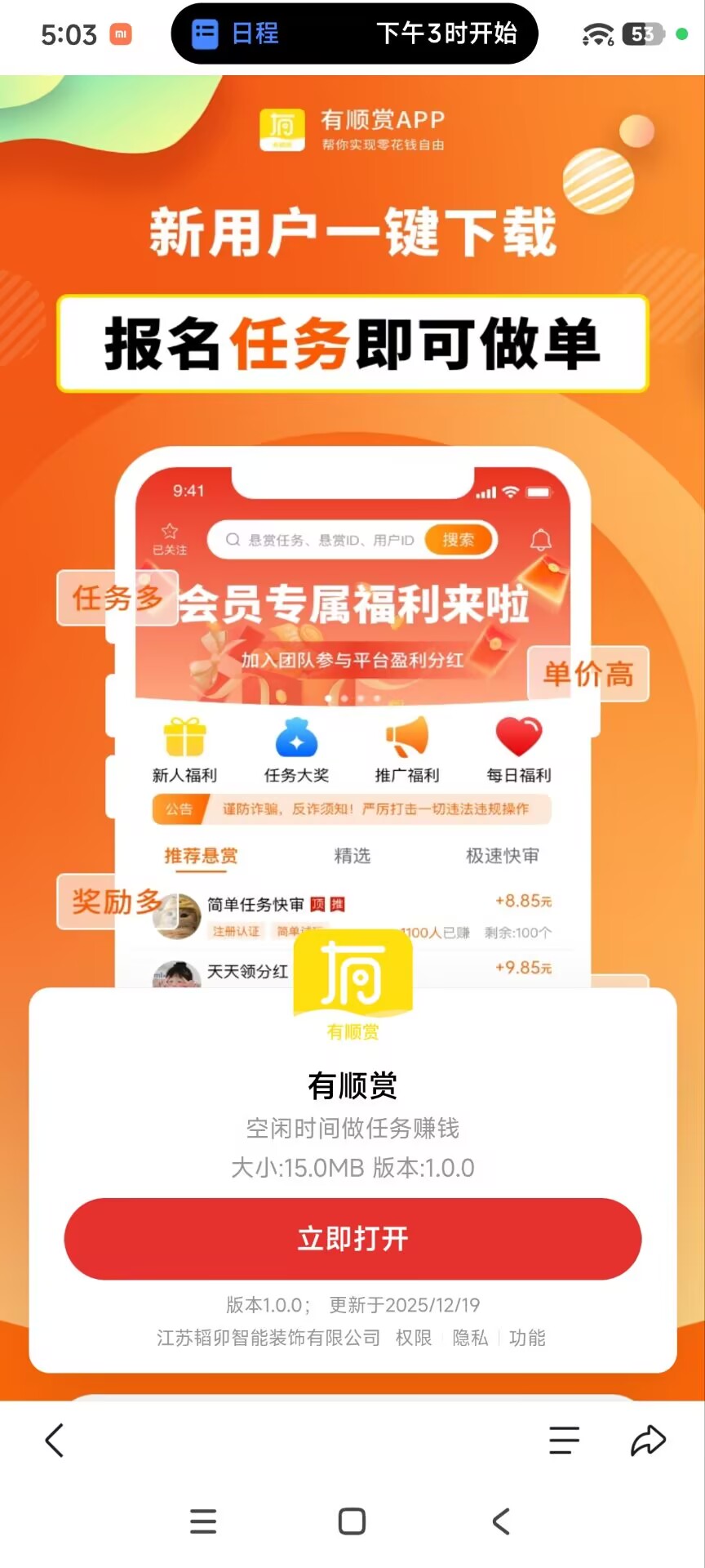 安卓下载 有顺赏,帮你实现零花钱自由。用户可以通过完成各种任务来赚取赏金,提供丰富的任务类型,包括调查问卷、APP下载、游戏试玩等。用户可以根据自己的兴趣和能力选择适合的任务,获得对应任务的奖励,最快1分钟即可... 有顺赏 有顺赏 支 持:安卓 大 小:21.72M 开发者: 提 现:1元起提现 说 明: 分 类:悬赏任务 下载量:195次 发 布:2025-12-24 手机扫码免费下载 纠错留言 #有顺赏截图 #有顺赏简介 有顺赏,帮你实现零花钱自由。用户可以通过完成各种任务来赚取赏金,提供丰富的任务类型,包括调查问卷、APP下载、游戏试玩等。用户可以根据自己的兴趣和能力选择适合的任务,获得对应任务的奖励,最快1分钟即可审核通过。